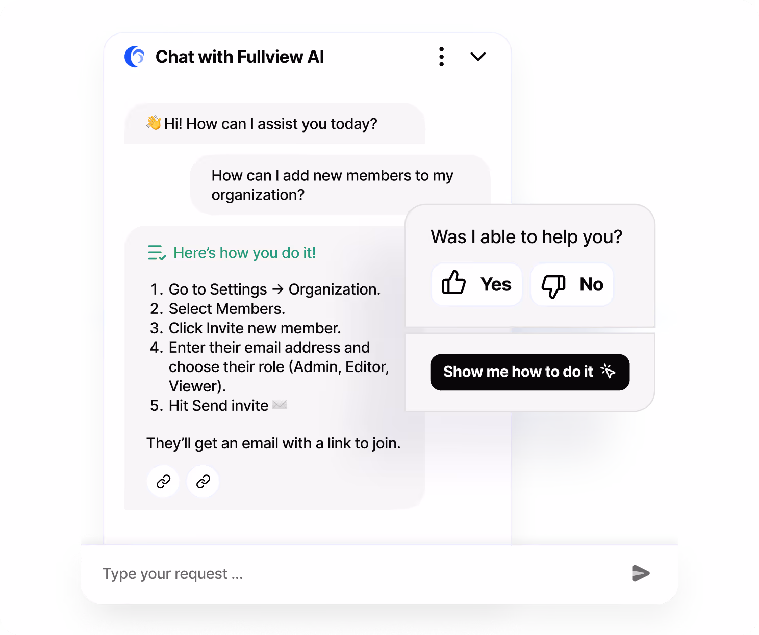 Fullview AI can see the UI of your product, understand it and help users find what they need, guide them how to accomplish tasks, or even do it for them. You can then review exactly what happened during the session with the customer, with our AI Replays. Fullview AI will work out of the box, but human training is available to make it even more accurate with more complex questions.
