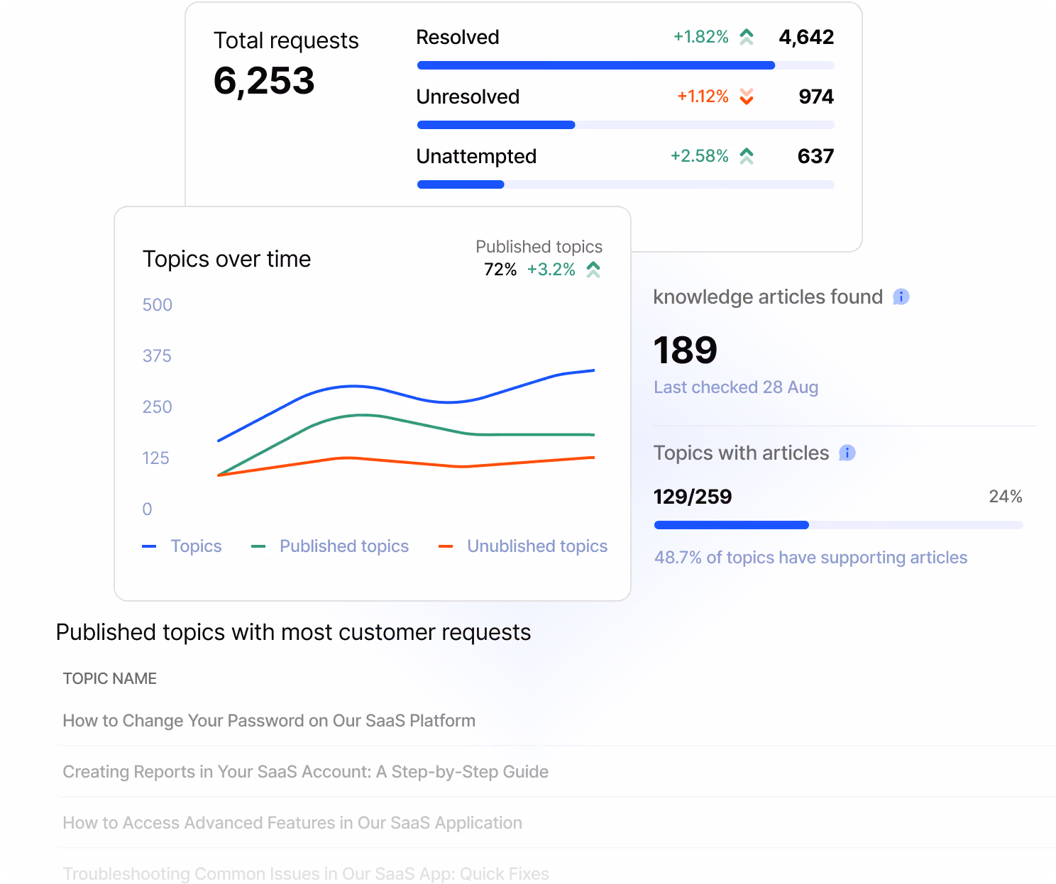 Detailed analytics and insights to trends, and knowledge gaps. Easily review topics and individual support requests for QA or escalation.