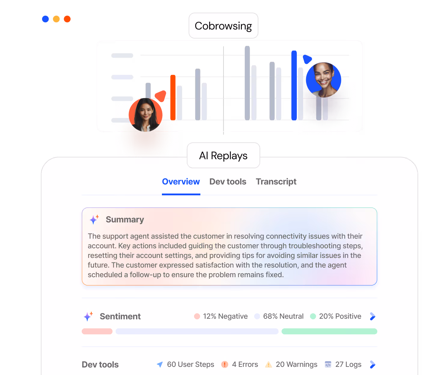 Seamlessly escalate from AI guidance to human guidance. Support agents can review automatic screen recordings of user issues to speed up escalations, and even jump into human-led visual guidance with cobrowsing.