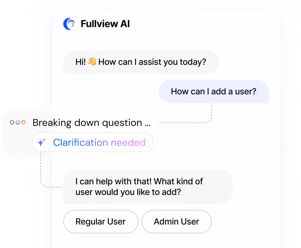 Fullview's conversational AI answers any customer questions with precise context and follows your custom guidelines to solve user issue faster, better and more securely.