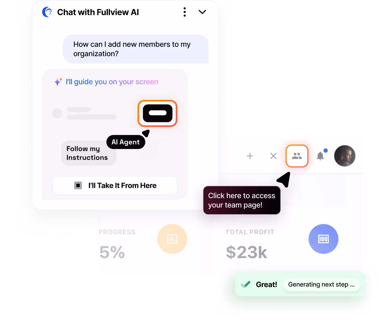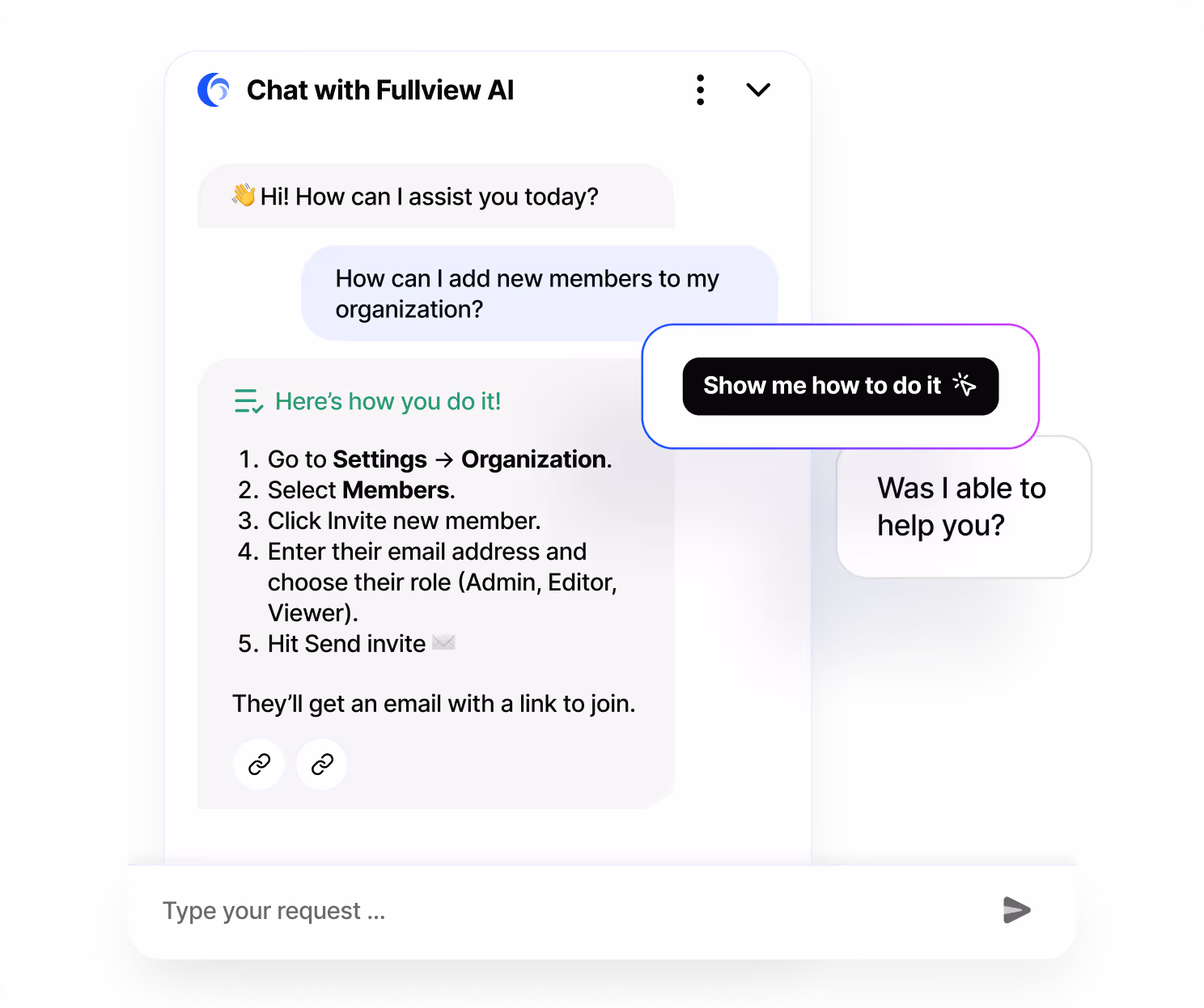 By helping users instantly with product questions, Fullview AI can drastically reduce your time to resolution, as well as decrease churn. It works as your own support agent + customer success manager.