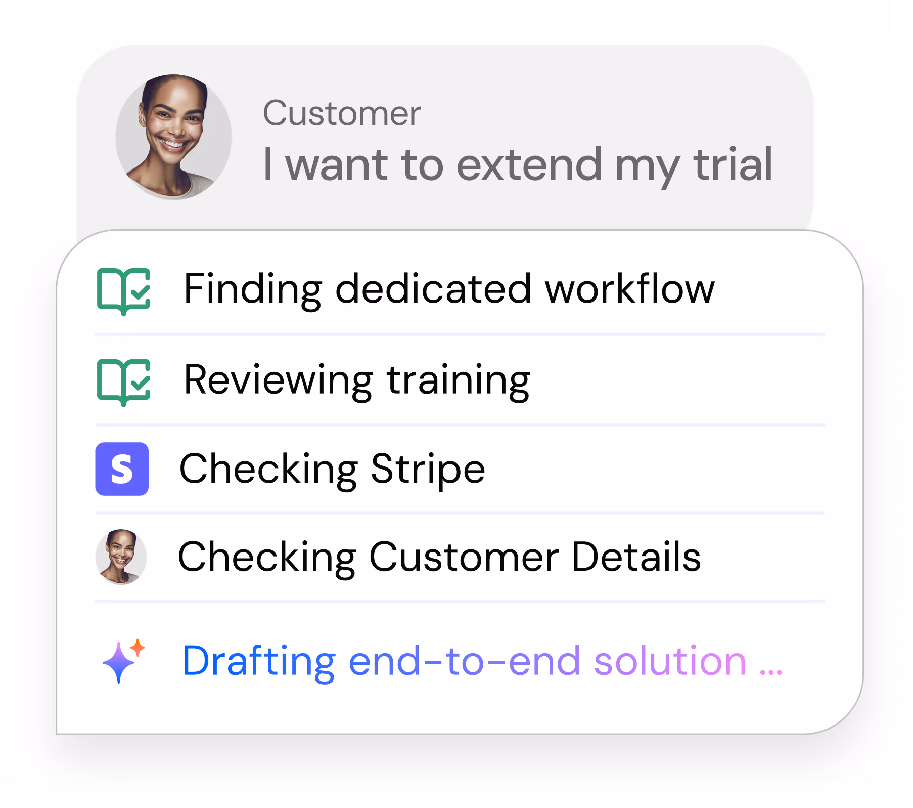 Resolve issues end-to-end inside the chat. The agent can trigger workflows like "Add User" or "Extend Trial" directly in your system to close up to 70% of tickets without escalation